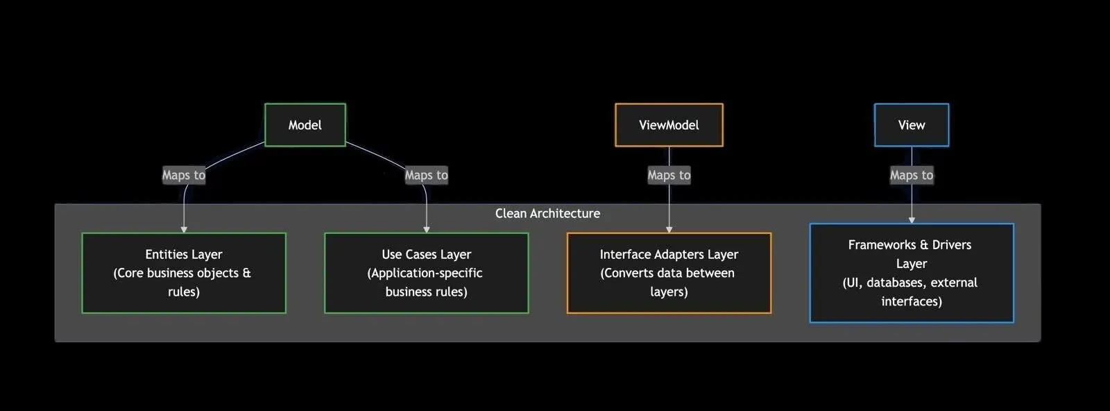 View), Präsentationslogik (ViewModel) und zugrunde liegenden Daten und Geschäftsregeln (Model). Diese Trennung macht den Code modularer und einfacher zu warten, was mit Clean Architecture's Betonung auf der Trennung von Belangen über verschiedene Schichten hinweg übereinstimmt. -