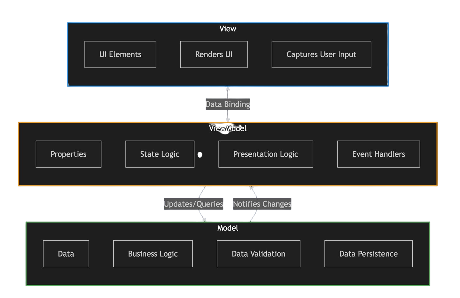 - Verbesserte Trennung von UI-Belangen: MVVM bietet klare Richtlinien für die Trennung von UI-Rendering von Präsentationslogik und Geschäftsregeln.