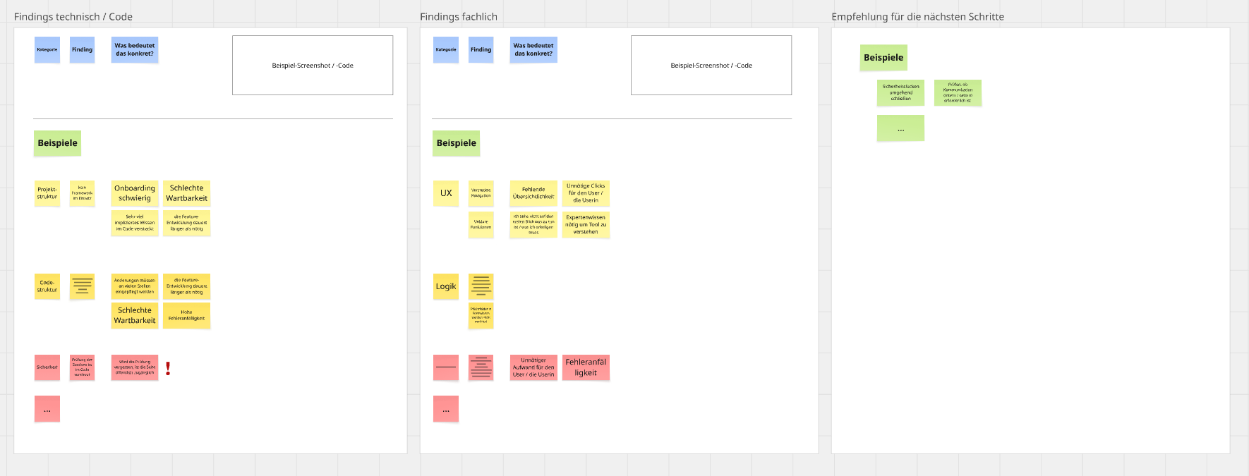 Während des gesamten Prozesses dokumentieren wir alles in einem gemeinsamen Miro-Board. Jeder Befund enthält den Kontext des Problems, einen relevanten Codeausschnitt, eine Erklärung, warum es wichtig ist, seinen Schweregrad und einen empfohlenen Ansatz zur Behebung. Dies schafft eine klare, transparente Grundlage für die Diskussion der nächsten Schritte mit dem Kundenteam und stellt sicher, dass wir mit einem gemeinsamen Verständnis über den aktuellen Zustand des Systems vorankommen.
