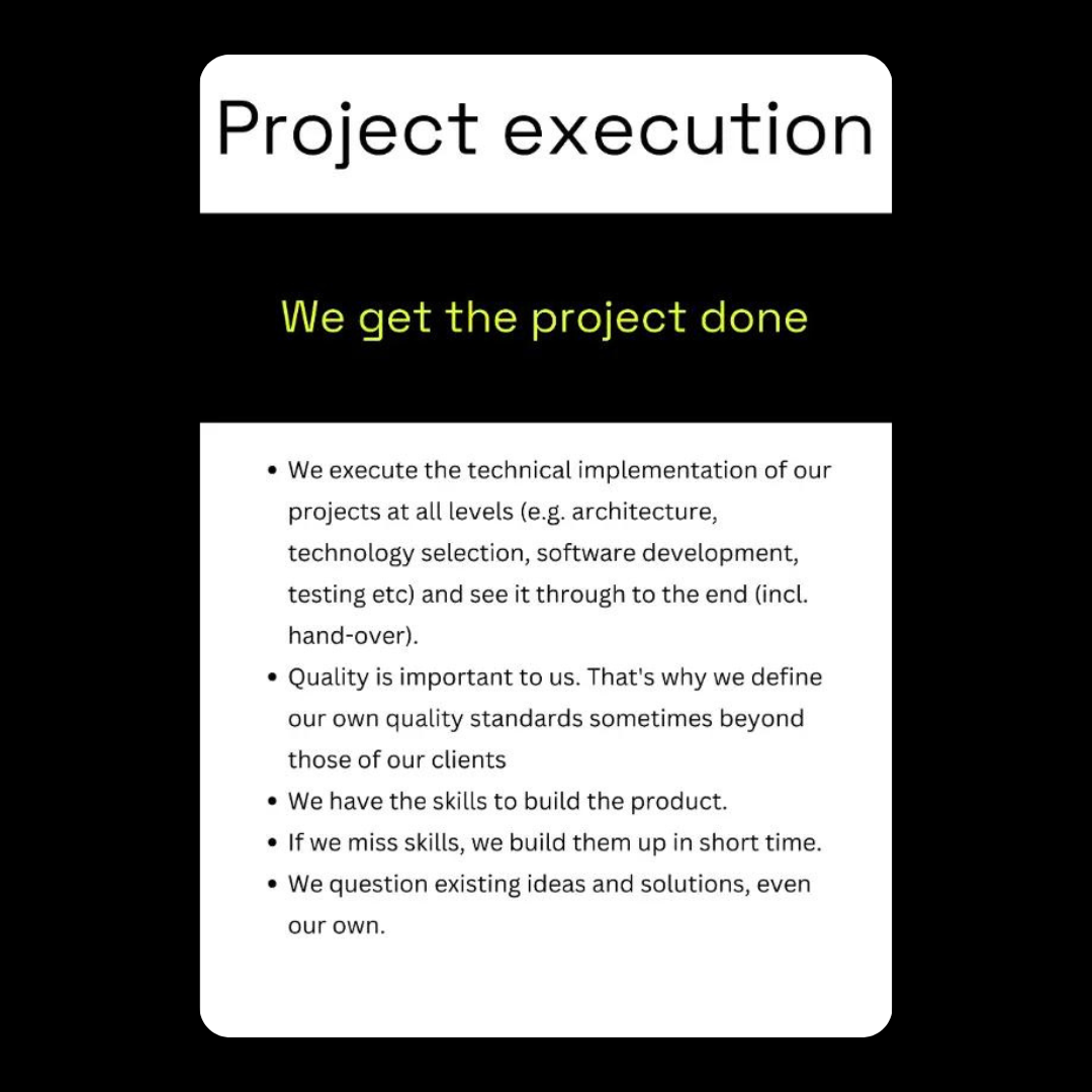 Zum Beispiel: Projektdurchführung - ein Prinzip, bei dem es darum geht, alles Notwendige zu tun, um das Projekt abzuschließen. Klingt einfach genug, ist aber unserer Erfahrung nach entscheidend, um auf Kurs zu bleiben und funktionierende Ergebnisse zu liefern.